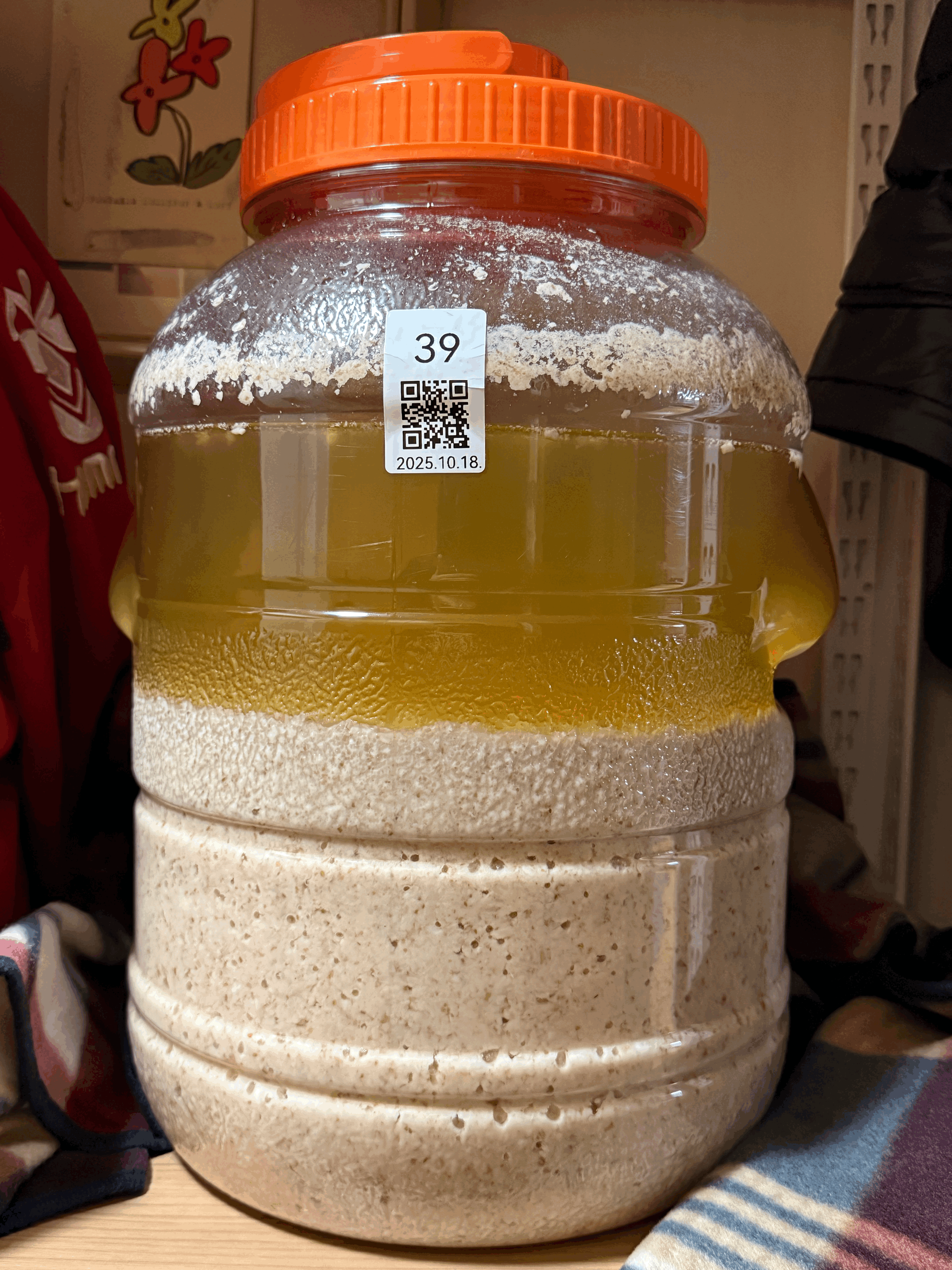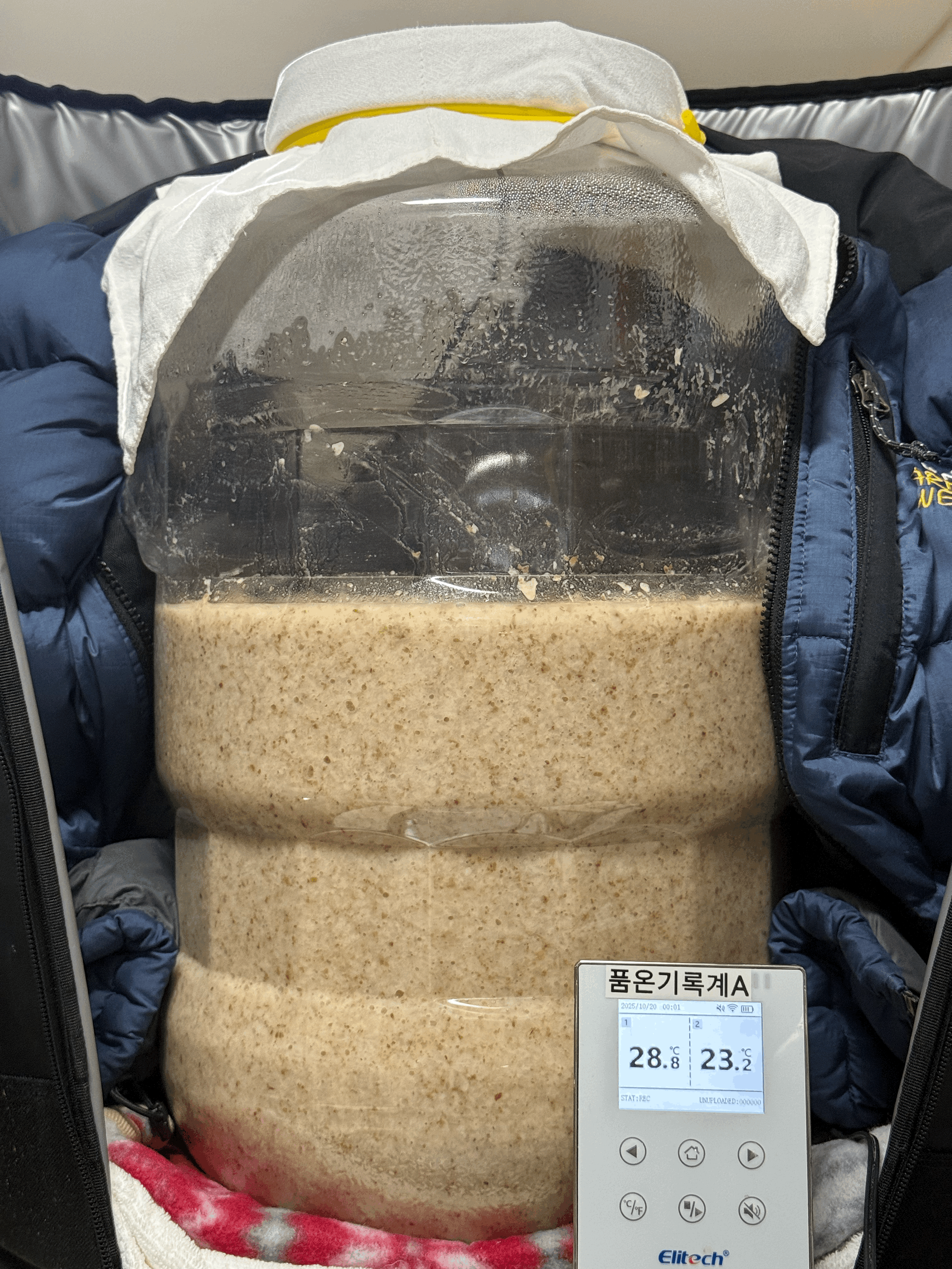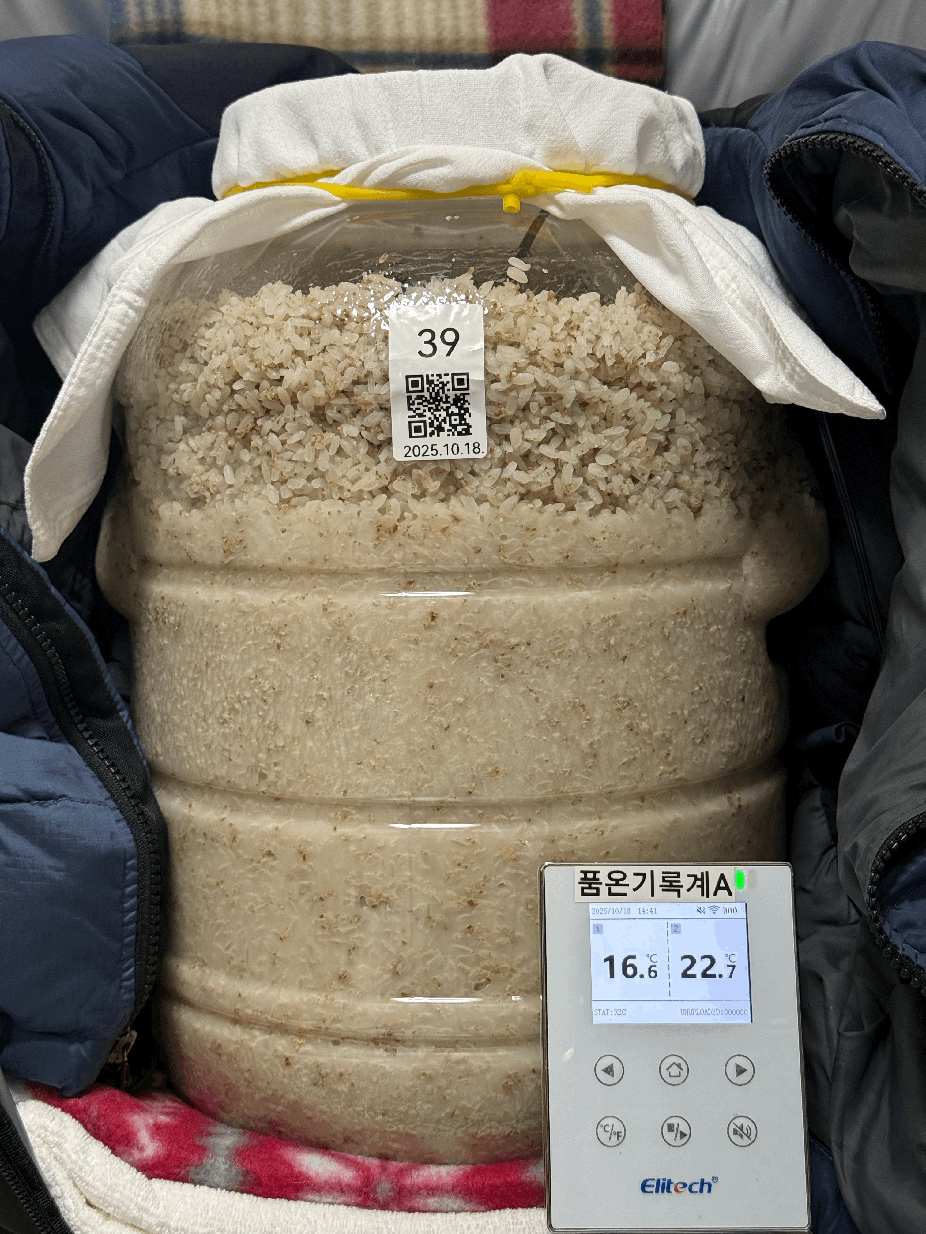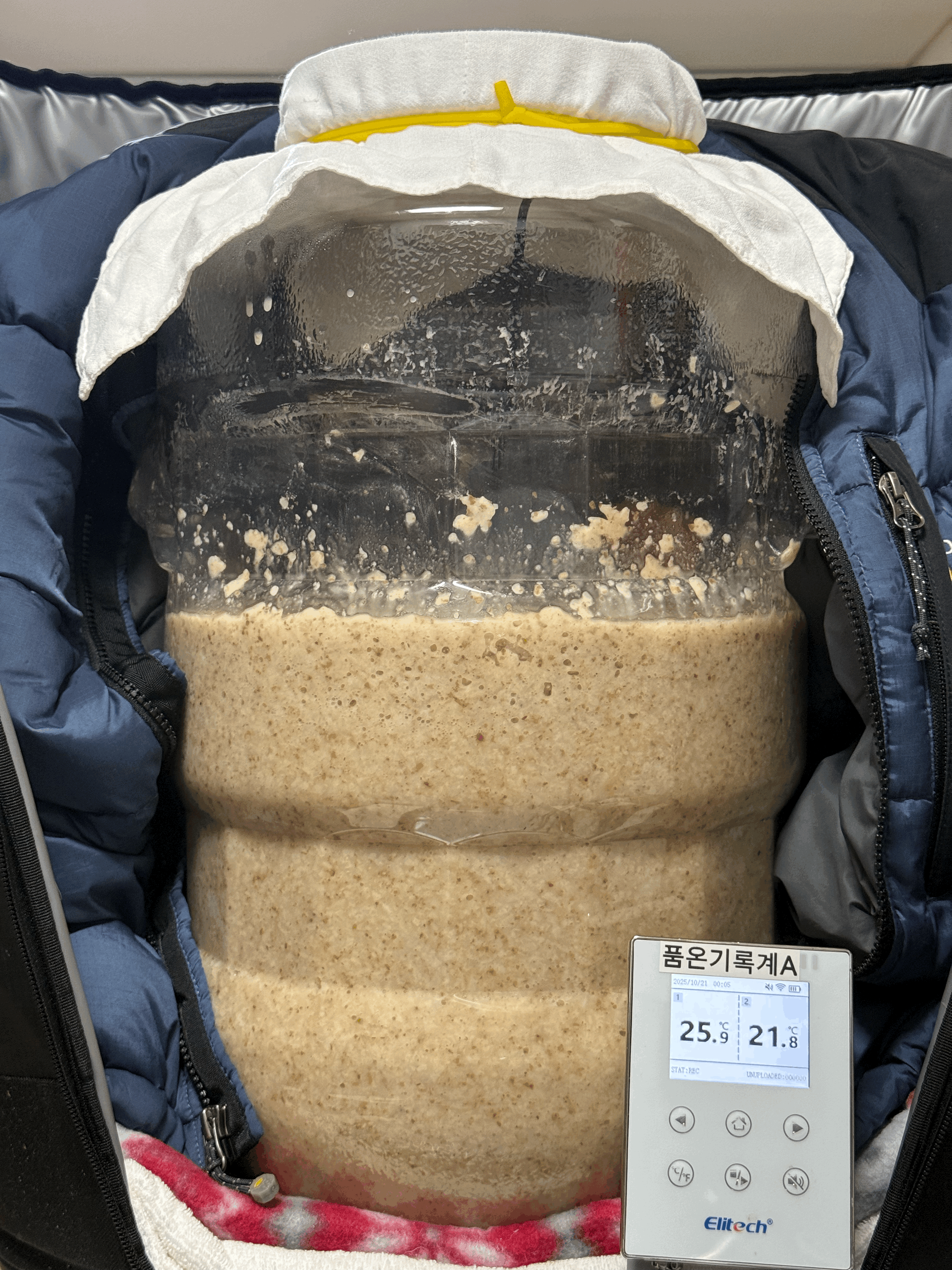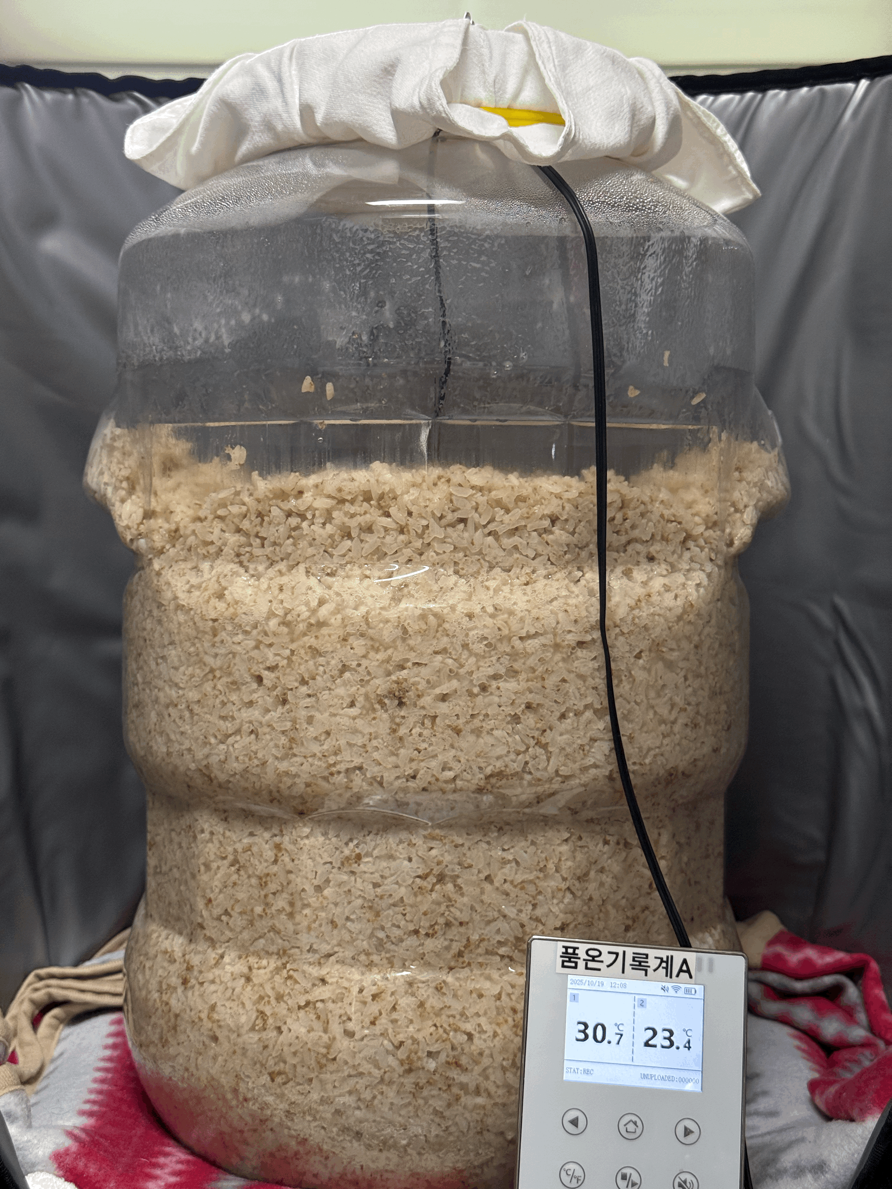 실온에서 후발효 시작한다. 빛 차단을 위해 무릎 담요로 감싸준다. 술독을 놓는 위치 기준으로 지난 주 실온은 24℃ 쯤이었는데,이번 주 들어 날씨가 추워져서 실온이 22℃ 수준으로 내려왔다.