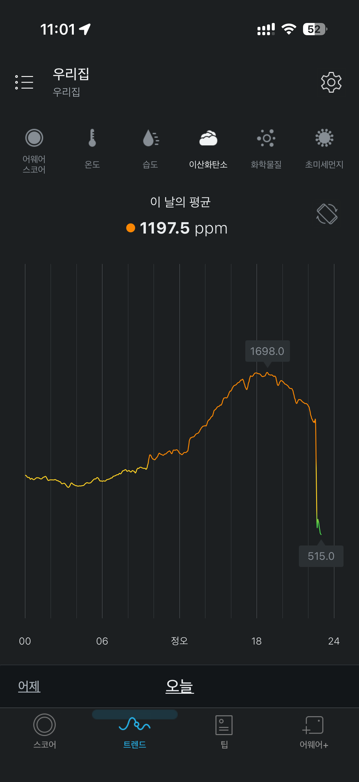 실내 이산화탄소 농도가 18시경 정점을 찍은 후 내려오고 있다. 실내 화학물질 농도는 16시경 정점을 찍은 후 유지하고 있다. 즉, 하루 종일 활발하게 발효해서 오후 늦게 절정에 도달했고, 저녁 이후 그 기세가 꺾이고 있다는 뜻이다. 환기시키니 실내 공기는 빠르게 호전되고 있다.