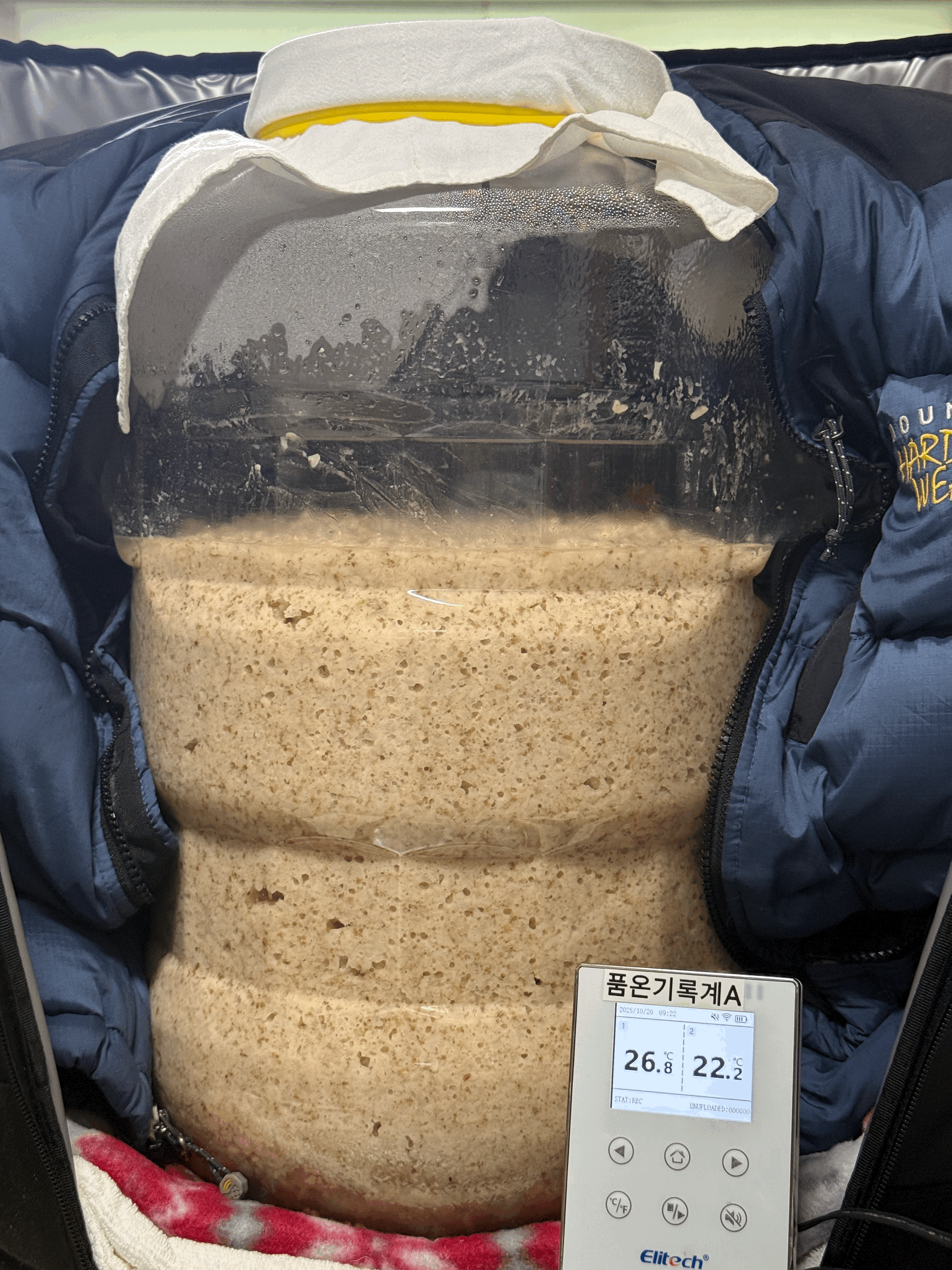 그런데 너무 조용하다. 아무래도 효모 증식이 덜 된 것 같다는 확신이 든다. 효모를 좀 더 증식시켜야겠다는 생각이 들어 뚜껑을 다시 열고, 면포로 덮은 후 고무줄로 묶어줬다. 소리를 들어보니 조용하다. 기포 터지는 소리가 5초 동안 1~2번 정도 밖에 들리지 않는다.