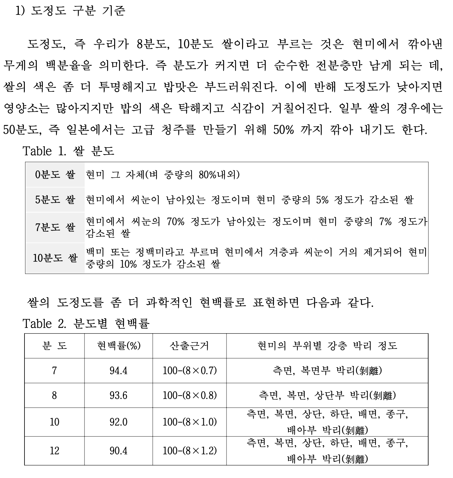 이 수식에 의하면, 15분도는 현백률 88.0%에 해당한다.