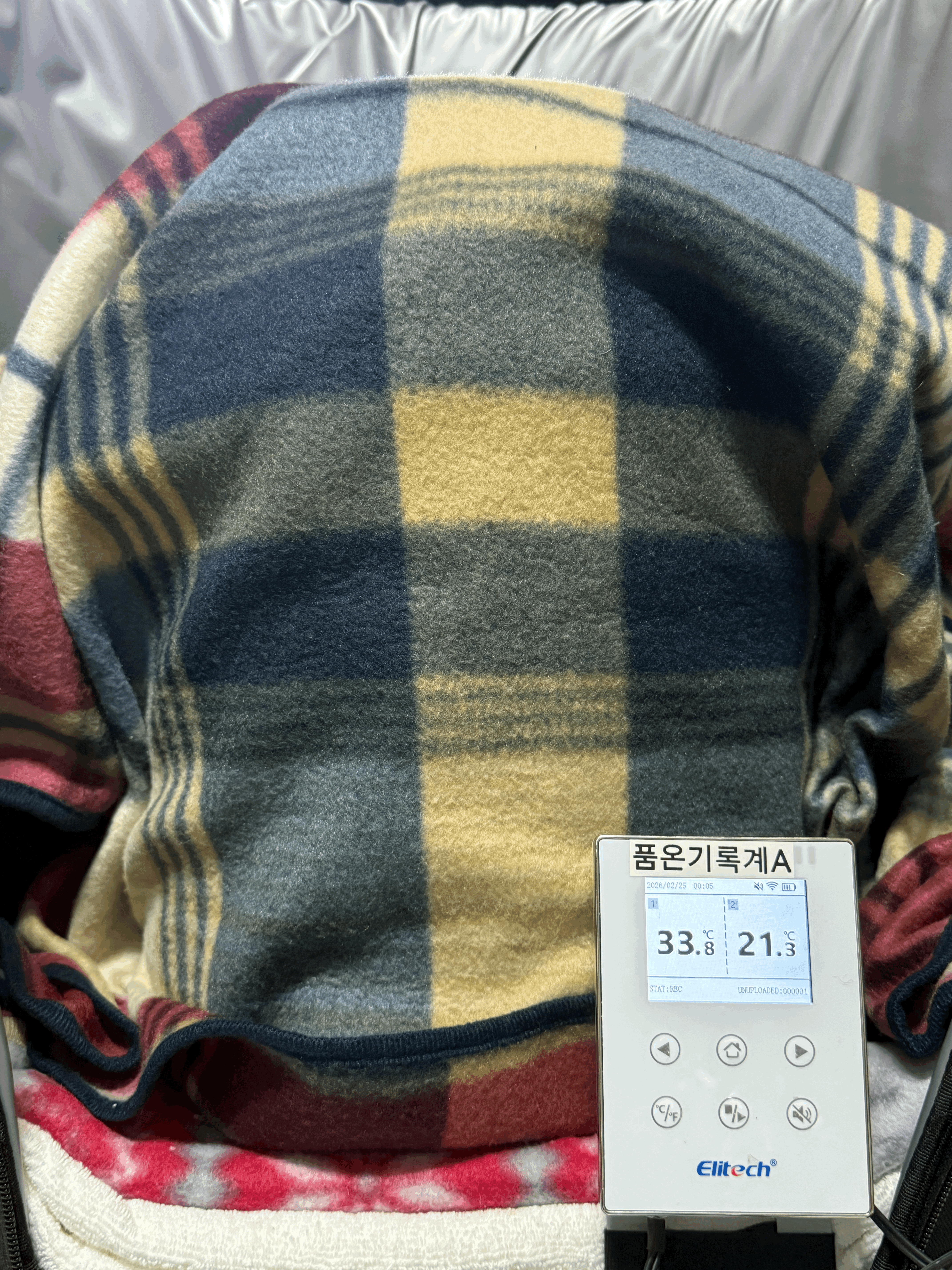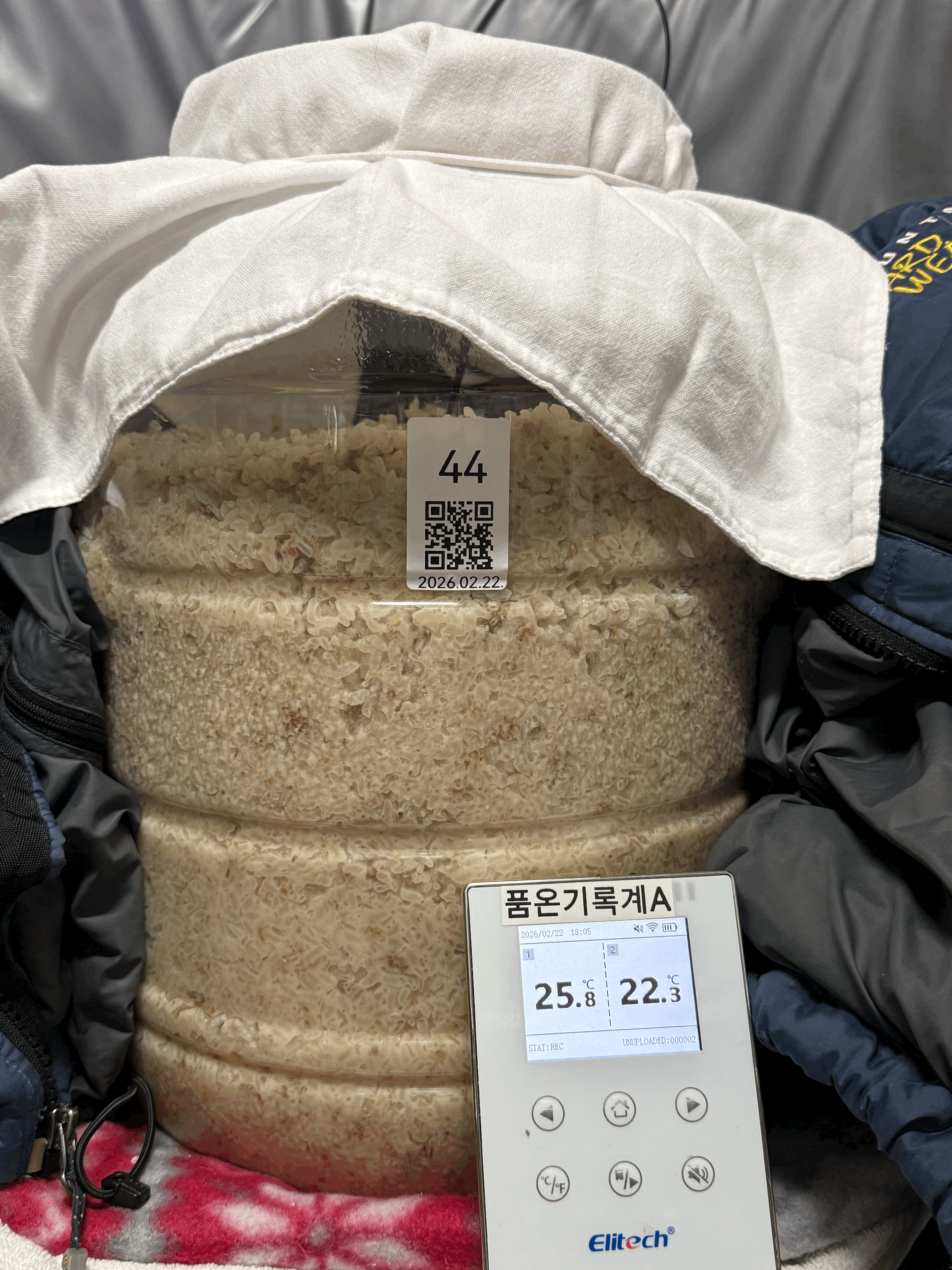 술덧 가운데에 온도 기록계의 품온 센서를 찔러 넣음. 온도 기록계의 다른 센서 하나는 보냉백 밖에 두고, 발효공간의 기온을 측정함. 술독 입구는 면포 덮고 고무줄로 동여 맴. 술독에 다운패딩 입히고, 보냉백 옆면만 지퍼로 잠그고, 보냉백 윗면은 완전히 열어둠. 술독 입구의 면포 위에는 무릎 담요를 덮어 보쌈을 마무리함. 사진 찍을 때만 보쌈을 열고 사진을 찍는다.