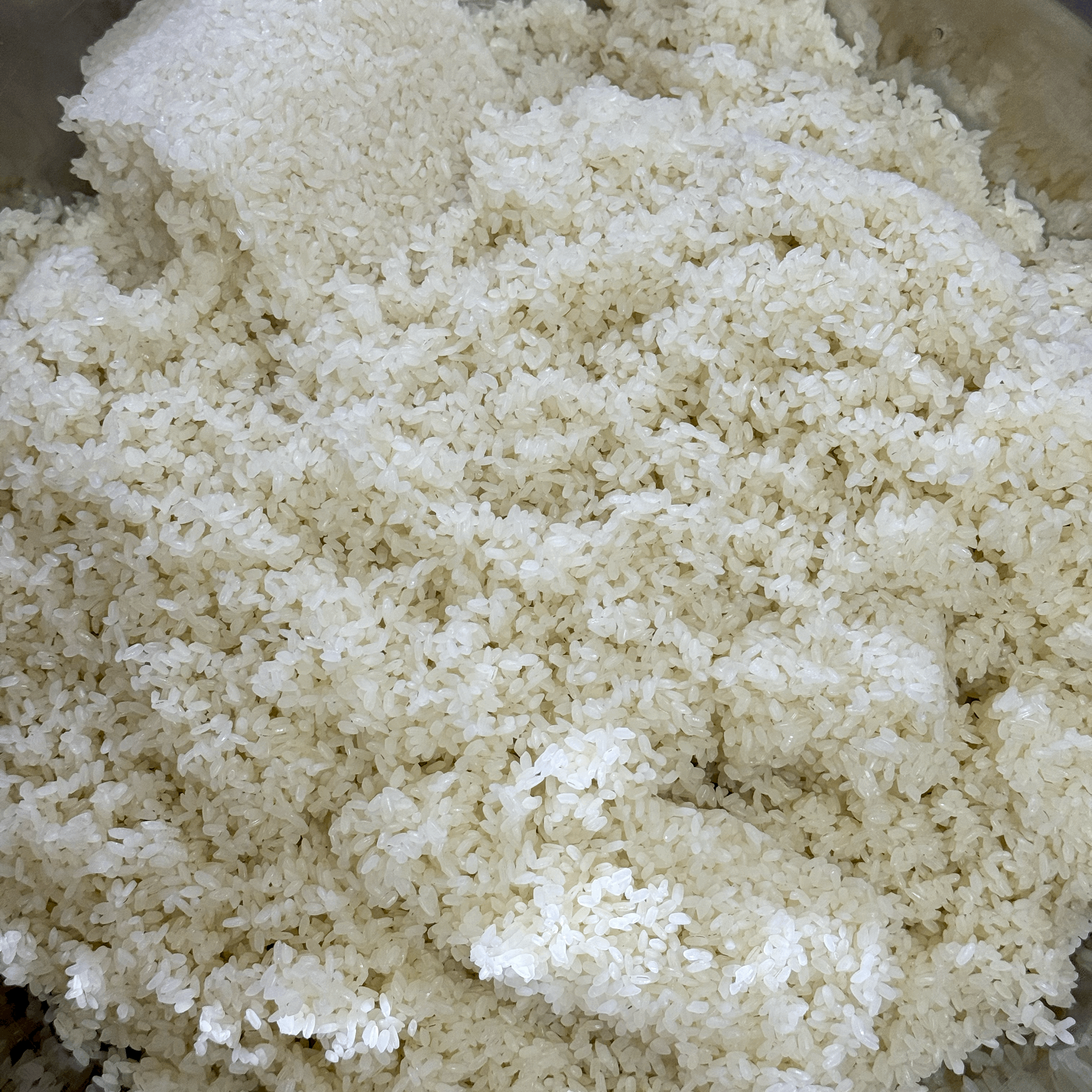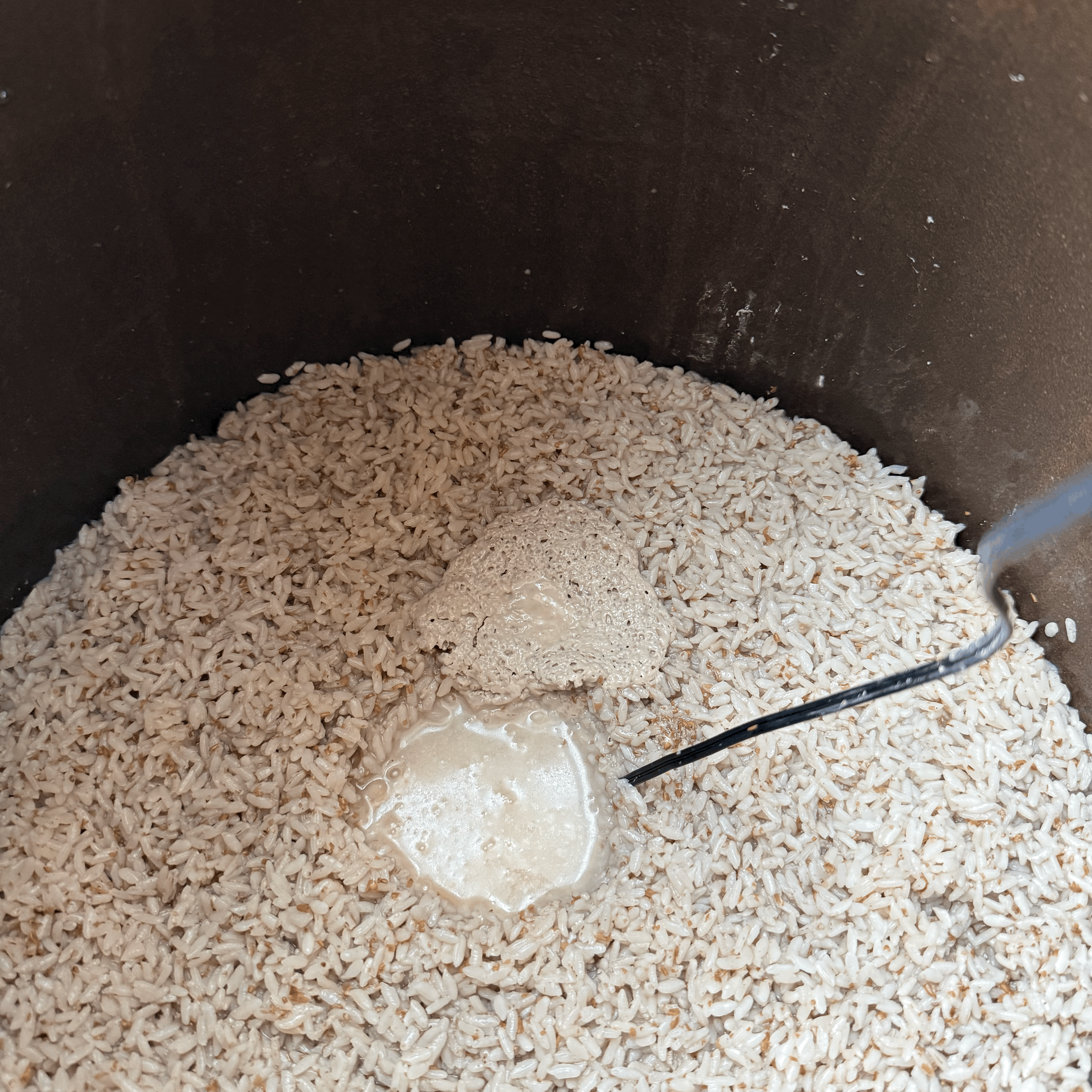 그 상태로 뜸 들인 후 지에밥을 양푼에 덜어내서 지에밥 무게가 쌀 무게의 2배 수준이 되도록 잘 섞어주면서 한 김 날린 후 술독에 넣은 후 밀봉하지는 하지 않을 예정이다.