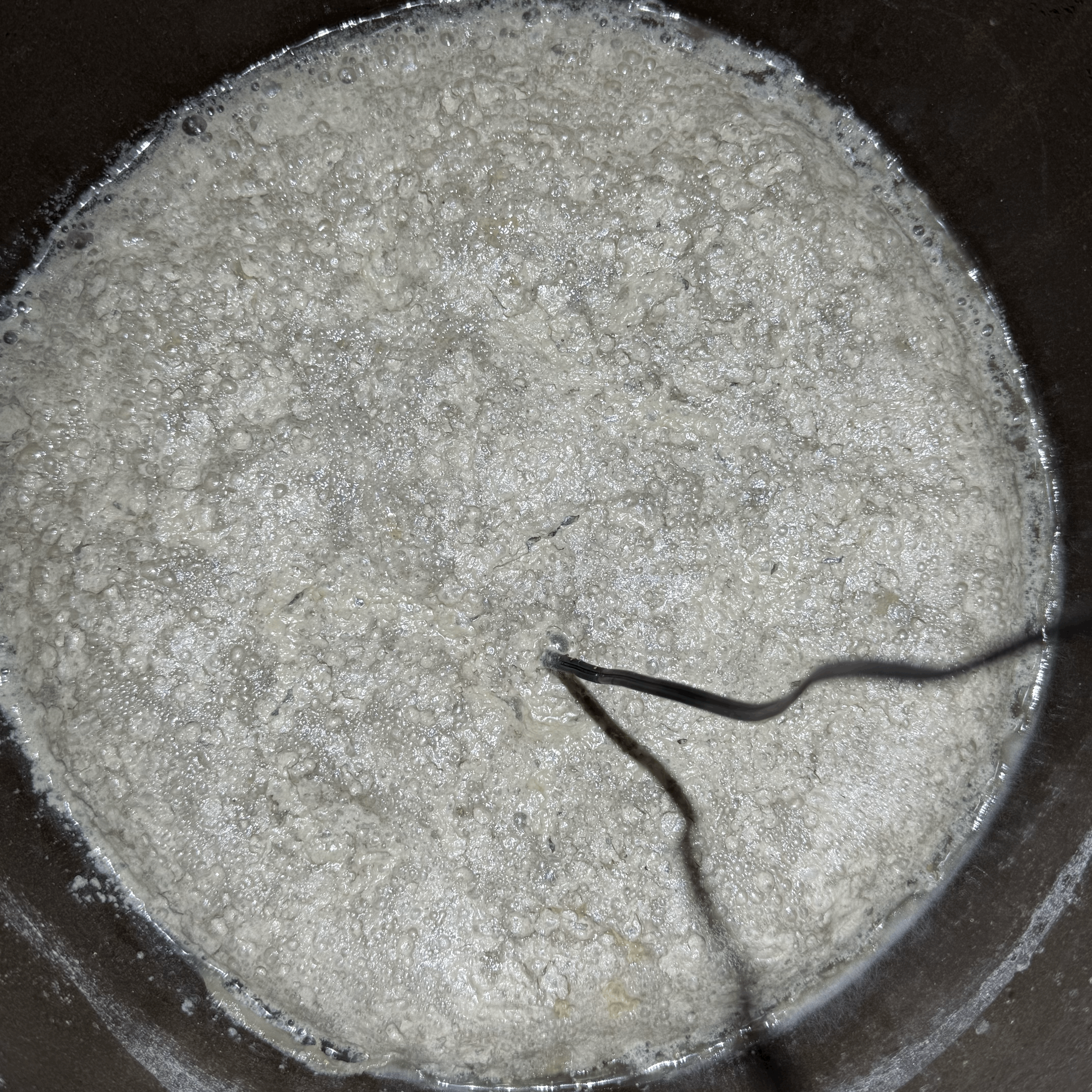 술덧은 끓은 후 다시 내려간 상태이고, 오염의 징후는 보이지 않는다.